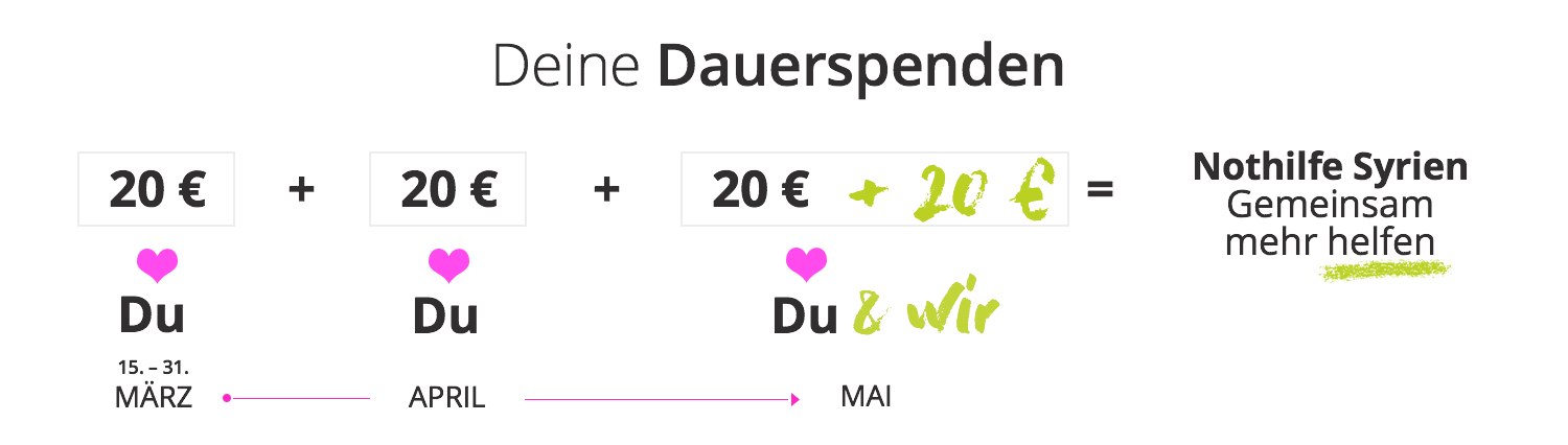 Wir freuen uns unheimlich, dass die Spendenbereitschaft für die großartigen Organisationen und ihre lebensrettende Arbeit vor Ort in Syrien so groß war. Im Zuge unserer Kampagne wurden neue monatliche Dauerspenden im Wert von rund 3.000 EUR angelegt, die wir jetzt noch verdoppelt haben! Nehmen wir doch dazu noch die über 7.000 EUR an Einzelspenden an die beteiligten Projekte, zücken den Taschenrechner und rechnen das Ganze mal durch… Wow! Eure Spenden und unsere Verdopplung zusammen bedeuten rund 40.000 EUR Spenden für Nothilfe in Syrien bis Ende 2018! Wir sagen von ganzem Herzen und bestimmt auch im Namen der Organisationen: Danke!