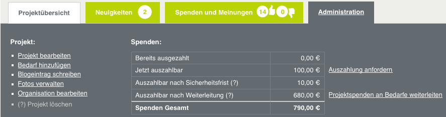 Dort können Sie die Bedarfe übersetzen (falls Sie ein zweisprachiges Projekt pflegen) und Spenden angeben, die Sie außerhalb von betterplace.org erhalten haben. So lange noch keine Spende auf den jeweiligen Bedarf eingegangen ist, können Sie den Bedarf auch noch bearbeiten oder löschen. Ist bereits eine Spende an diesen Bedarf geflossen, ist eine nachträgliche Veränderung nicht mehr möglich.