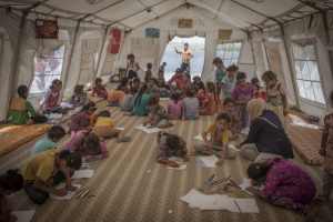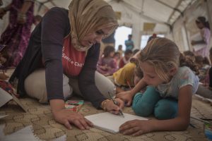 Auch der Alltag im Flüchtlingscamp ist nicht leicht. Die Familien leben in Zelten, wissen oft nicht, was die Zukunft bringt. Kinder leiden unter dieser Unsicherheit. In den Schutz- und Spielräumen finden sie Geborgenheit. „Viele Kinder im Camp haben keine Freunde,“ erzählt Arwas Mutter. „Sobald sie in den Spielraum von Save the Children gehen, ändert sich das.“ Von geschulten Mitarbeitern betreut können Mädchen und Jungen in den Räumen spielen, lernen und einfach Kind sein – und ihren schweren Alltag und ihre Erlebnisse für einen Moment vergessen.