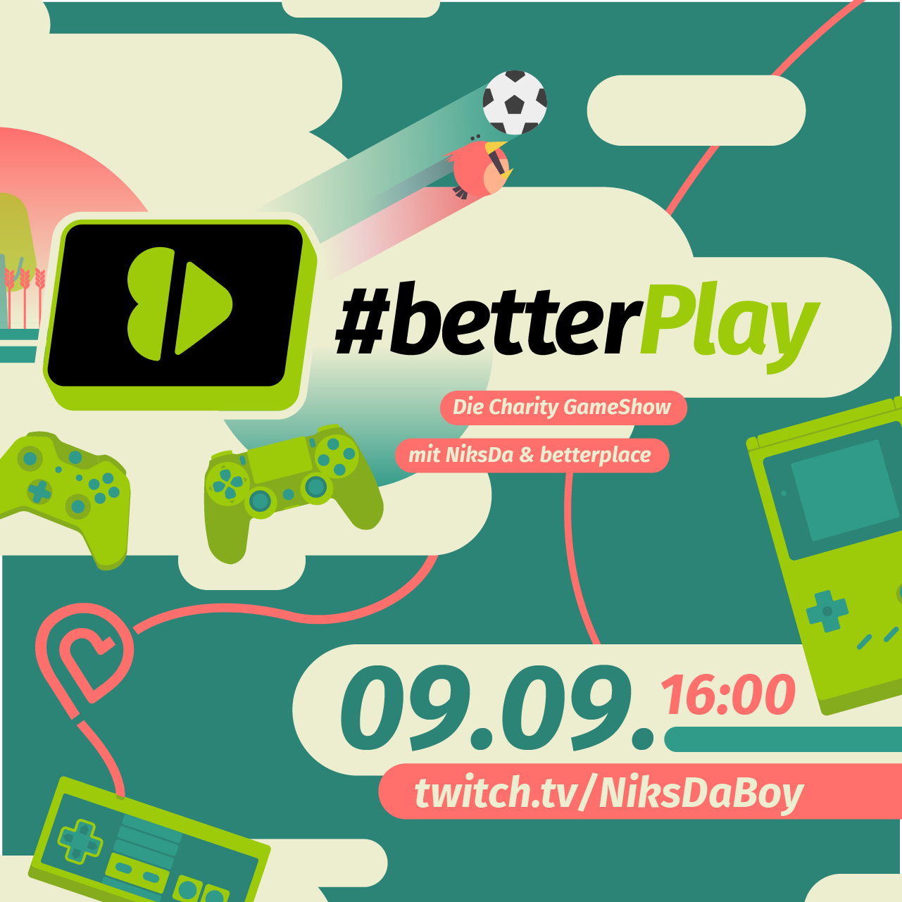 Und auch, wenn’s im Teaser vielleicht nicht so aussieht – am 9. September um 16 Uhr geht’s auch schon los! Auf https://www.twitch.tv/niksdaboy könnt ihr live dabei sein, wenn die erste Charity Game Show startet, und drei großartige soziale Projekte unterstützen! 👾