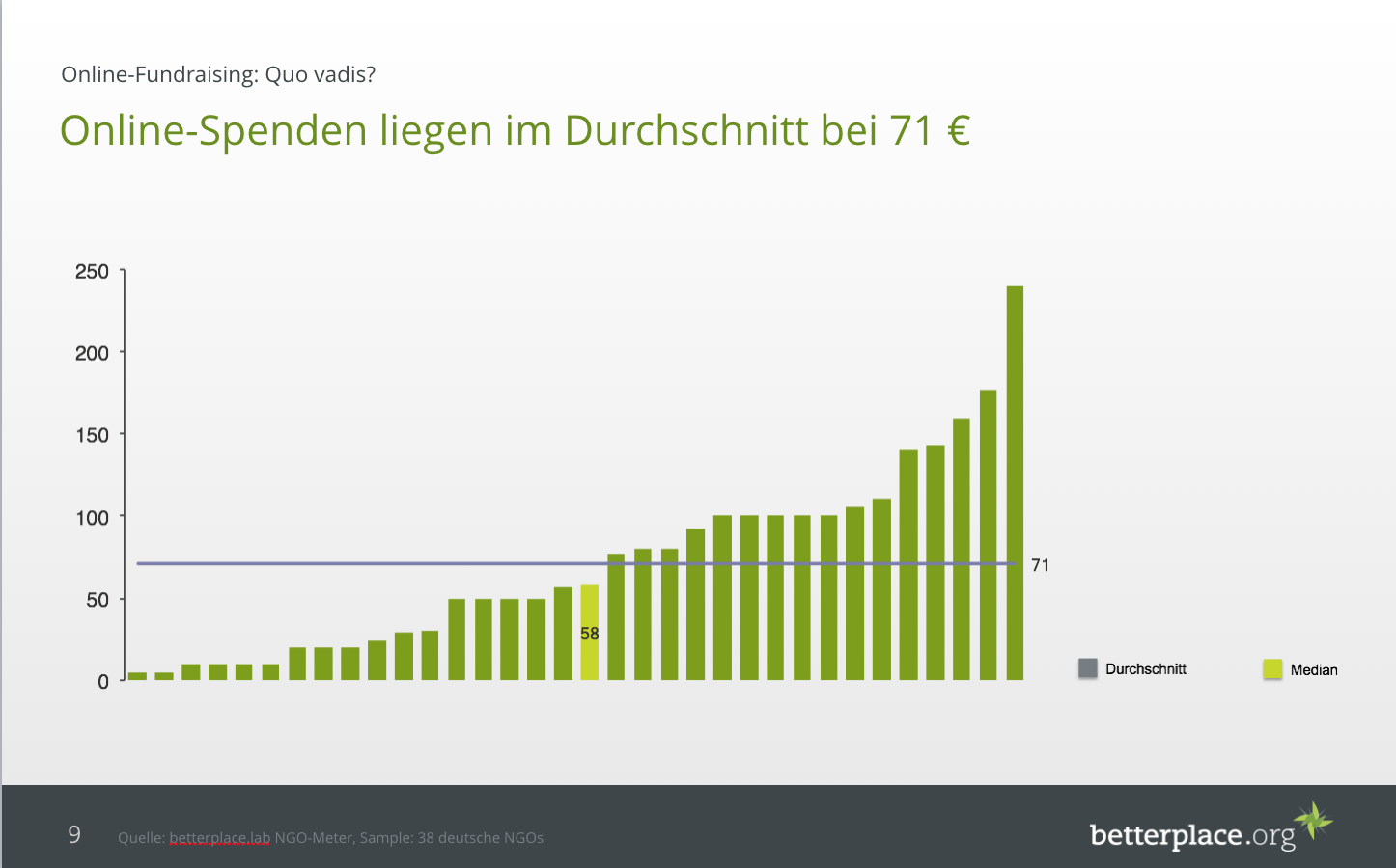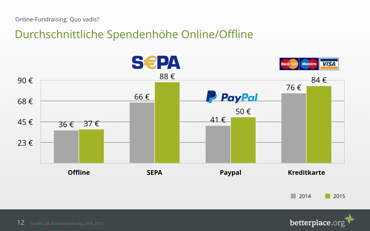 Die durchschnittliche Spendenhöhe unterscheidet sich zudem auch abhängig von der gewählten Zahlungsmethode. Auf betterplace.org beträgt die durchschnittliche Spende per Lastschrift 88 EUR während sie mit Paypal bei 50 EUR liegt.