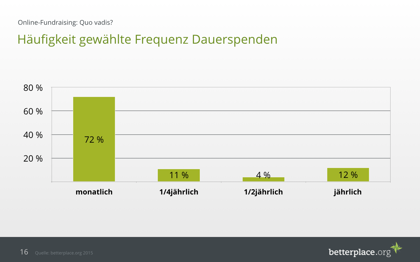 Beim Deutschen Fundraising Kongress 2016 habe ich, Björn Lampe, Vorstand von betterplace.org, die neuesten Zahlen des NGO-Meters präsentiert und mit Statistiken aus der Spendenplattform betterplace.org ergänzt. Für die Zahlen aus der Plattform wurden im Vorfeld über 100.000 Spenden aus dem Jahr 2015 analysiert und ausgewertet. Sie lassen Rückschlüsse auf das Verhalten von deutschen Online Spendern zu, die sicherlich nicht allgemeingültig sind, aber dennoch eine Richtung aufzeigen.