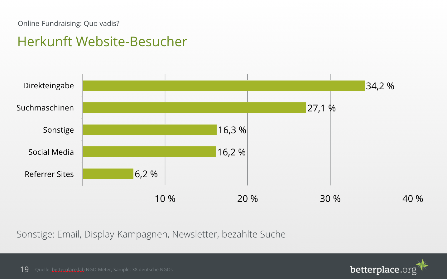 Doch woher kommen die Besucher der NGO-Webseiten? Grundsätzlich lässt sich sagen, dass die direkte Eingabe der URL als auch Suchmaschinen wichtigste Quellen sind: