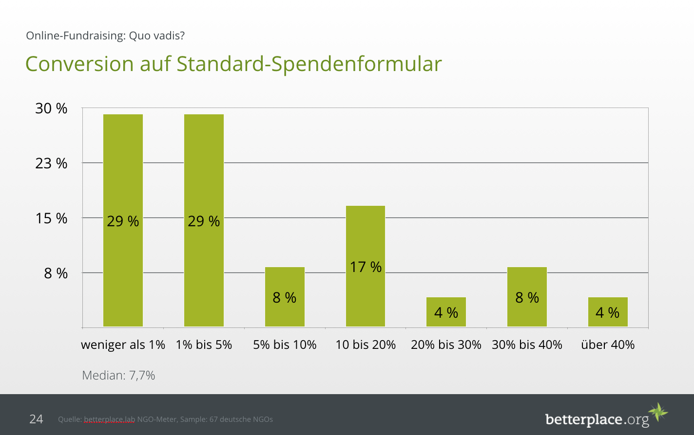 Entscheidend bleibt über alle Kanäle wie viele Menschen tatsächlich auch zu Spendern werden. Die Conversion Rate auf dem jeweiligen Standard-Spendenformular der Organisationen zeigt große Unterschiede auf. Der Median-Wert liegt bei 7,7% und damit relativ niedrig. Hier liegt offensichtliches Optimierungs-Potential. Der Durchschnitt hingegen weist 19% aus und befindet sich damit im erwartbaren Bereich: