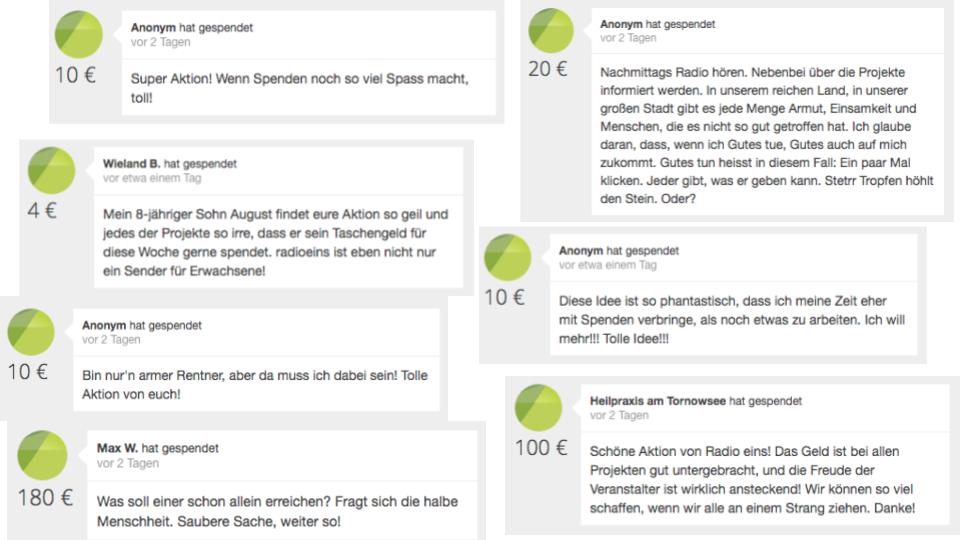 Das Endergebnis der Spendenaktion übertraf dann schlussendlich die Erwartungen aller Beteiligten. Über 50.000 EUR von über 1000 Spender*innen kamen am Ende des Crowd Fun Days zusammen: für die vier Projekte ein gigantischer Schritt nach vorne in ihrem Engagement und für radioeins und betterplace.org ein wunderschöner Erfolg! Auch bei uns im betterplace-Büro wurde den ganzen Tag über mitgefiebert. Vor allem die Spender*innenkommentare zusätzlich zur riesigen Spendenbereitschaft lesen sich ganz herzerwärmend. Hier wird ganz deutlich, dass jede*r mit einem kleinen Beitrag zu einem großen Ergebnis beitragen kann! Auch wenn man manchmal, so der Kommentar einer weiteren Spenderin, “ans Spenden erinnert werden muss”. Das machen wir doch gern. Allerspätestens beim nächsten Crowd Fun Day.